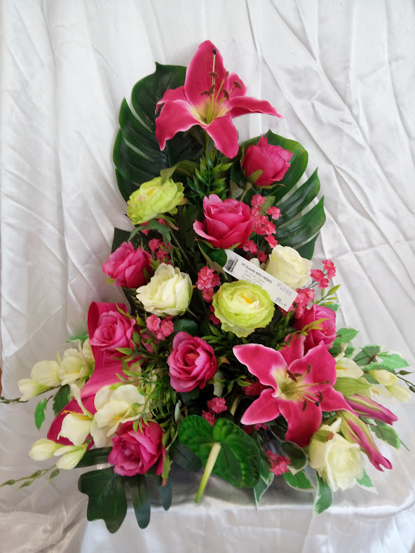 - Les compositions florales peuvent être artificielles ou naturelles. L’ensemble permet aux proches de témoigner leur chagrin.